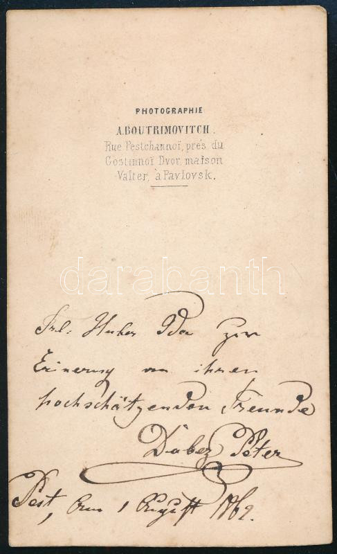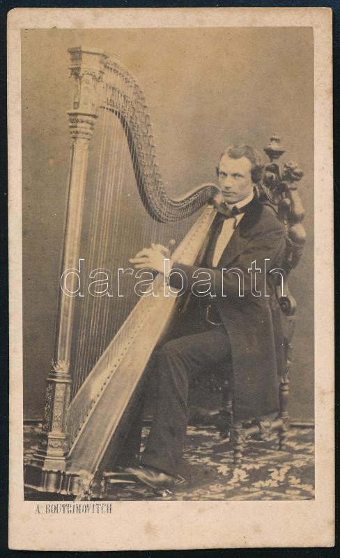 1862 Dubez Péter hárfavirtuóz A. Boutrimovitch (St. Petersburg.) zenész hárfával, hátoldalon feliratozott fotó, magyar vonatkozású felirattal, 10,5×6,5 cm