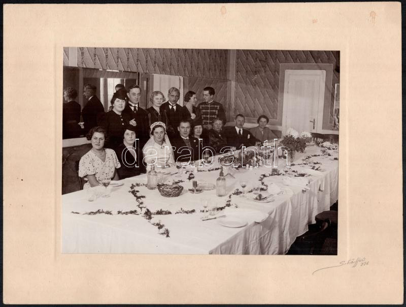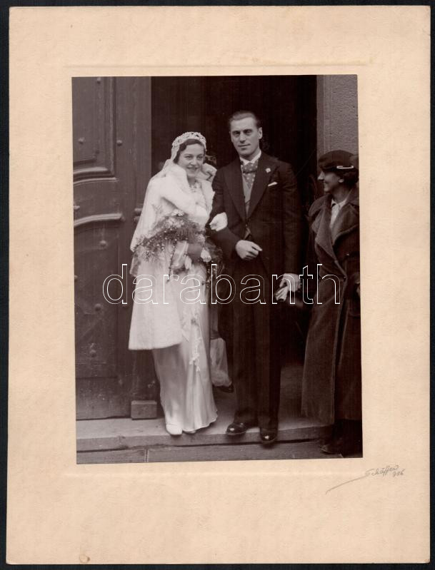 1936 Fiatal pár esküvői fotói, 2 db nagyméretű, kartonra kasírozott fotó, Schäffer Gyula jelzett felvételei, az egyik a hátoldalon feliratozva a képen szereplők nevével, 22,5x17 cm