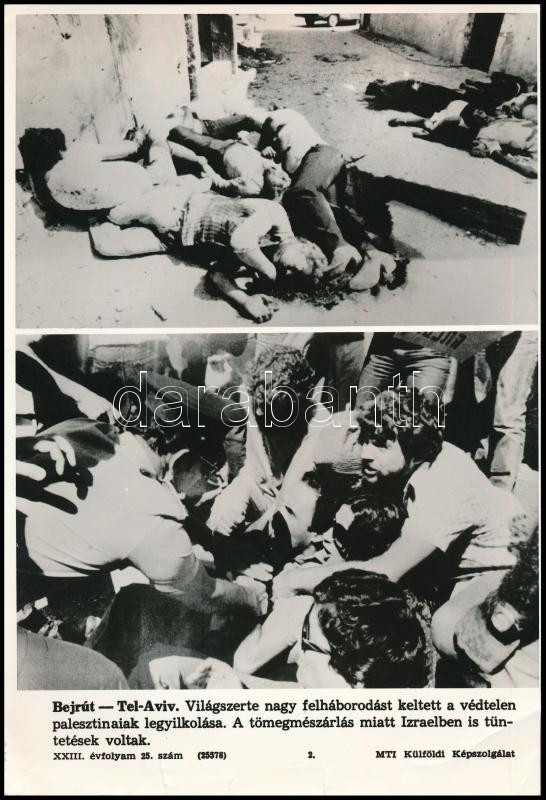 Bejrút - Tel-Aviv. Világszerte nagy felháborodást keltett a védtelen palesztinaiak legyilkolása. A tömegmészárlás miatt Izraelben is tüntetések voltak. XXIII. évfolyam 25. szám (25578) MTI Külföldi Képszolgálat. Kis szakadások az alján. 27x18,5 cm / Beirut - Tel Aviv. The slaughter of defenceless Palestinians has sparked outrage around the world. There were also protests in Israel over the massacre.