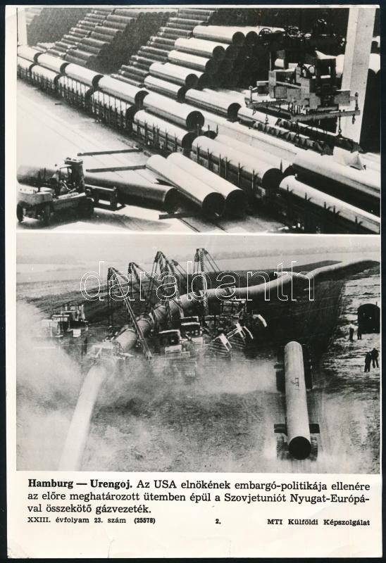 Hamburg - Urengoj. Az USA elnökének embargó-politikája ellenére az előre meghatározott ütemben épül a Szovjetuniót Nyugat-Európával összekötő gázvezeték. XXIII. évfolyam 23. szám (25578) MTI Külföldi Képszolgálat. Alján kis szakadásokkal. 27x18,5 cm / Despite the US President's embargo policy, the gas pipeline linking the Soviet Union to Western Europe is built at the planned pace.