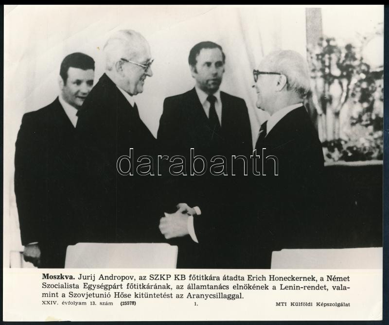 Moszkva. Jurij Andropov, az SZKP KB főtitkára átadta Erich Honeckernek, a Német Szocialista Egységpárt főtitkárának, az államtanács elnökének a Lenin-rendet, valamint a Szovjetunió Hőse kitüntetést az Aranycsillaggal. XXIV. évfolyam 13. szám (25578) MTI Külföldi Képszolgálat. Jó állapotban. 20,5x24 cm / General Secretary of the Socialist Unity Party, Chairman of the State Council, the Order of Lenin, and the Hero of the USSR with the Gold Star.