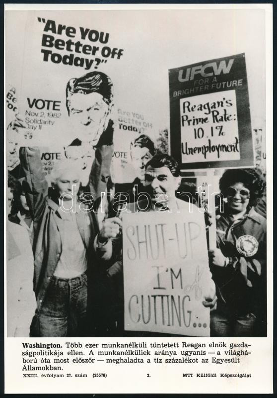 Washington. Több ezer munkanélküli tüntetett Reagan elnök gazdaságpolitikája ellen. A munkanélküliek aránya ugyanis, a világháború óta most először meghaladta a tíz százalékot az Egyesült Államokban. XXIII. évfolyam 27. szám (25578) MTI Külföldi Képszolgálat. Jó állapotban. 27x18,5 cm / Thousands of unemployed protested against President Reagan's economic policies. For the first time since the end of World War II, the unemployment rate in the United States has exceeded ten percent.