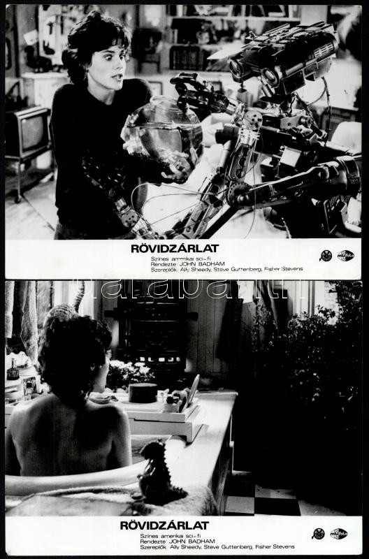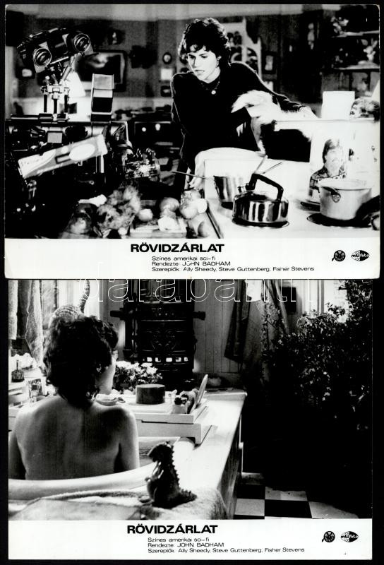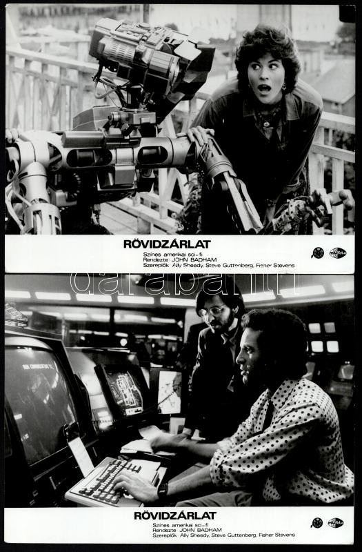 cca 1986 ,,Rövidzárlat" című amerikai sci-fi vígjáték jelenetei és szereplői, 8 db vintage produkciós filmfotó, ezüst zselatinos fotópapíron, a használatból eredő (esetleges) kisebb hibákkal, 18x24 cm