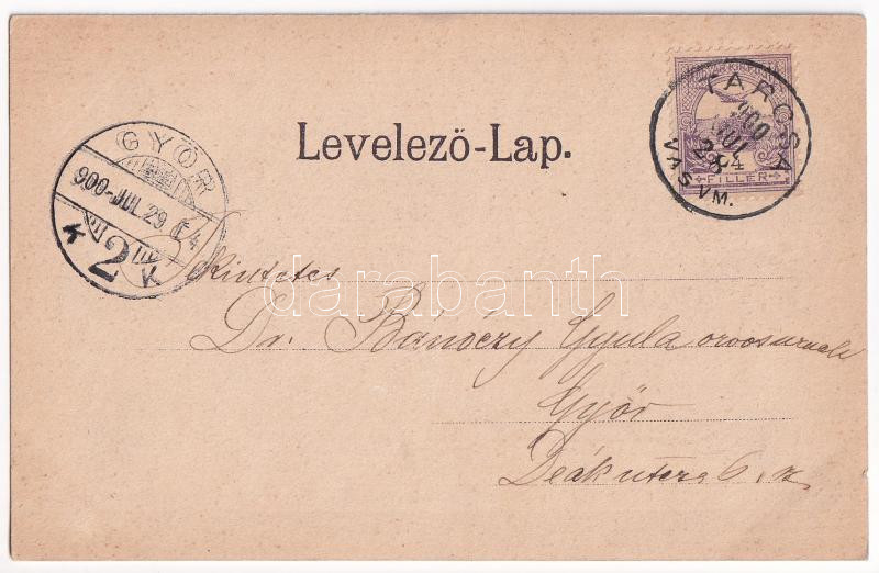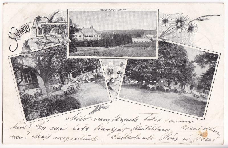 1905 Sóshegy, Sulzriegel (Tarcsa, Tarcsafürdő, Bad Tatzmannsdorf); Schlögel féle vendéglő, étterem, kert, látkép a teraszról / Blick von Veranda, Restauration / restaurant, inn, garden, general view. Art Nouveau, floral