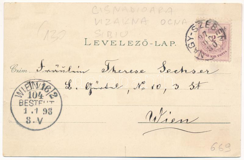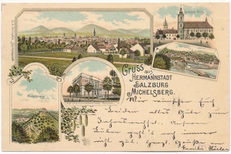 1897 (Vorläufer) Nagyszeben, Hermannstadt, Sibiu; Grosser Ring, Salzburg, Michelsberg, Naturwissenschaftliches Museum / Vízakna, Kisdisznód, tér, Természettudományi múzeum / Ocna Sibiului, Cisnadioara, museum. G. A. Seraphin Art Nouveau, floral, litho