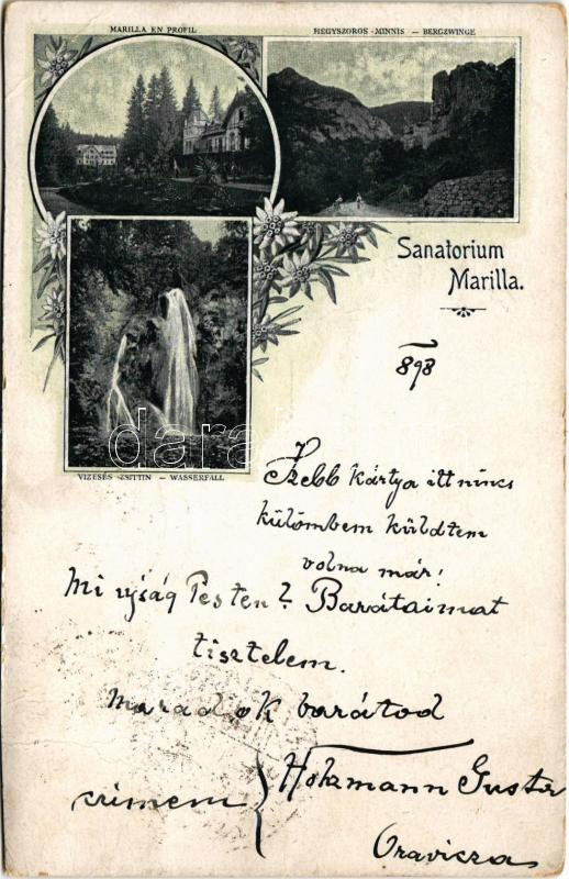 Leírás: 1898 (Vorläufer) Marilla, Marillavölgy, Marila; Sanatorium Marilla, Marilla en Profil / Szanatórium, Minnis-hegyszoros, Zsittin-vízesés / sanatorium, mountain pass, waterfall, spa. Art Nouveau, floral (vágott / cut)