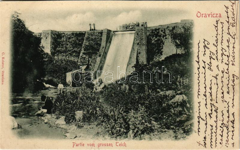 Leírás: 1899 (Vorläufer) Oravica, Oravita; Nagy-tó és vízfogó. C. Kehrer / grossen Teich / lake with waterfall, dam (Rb)
