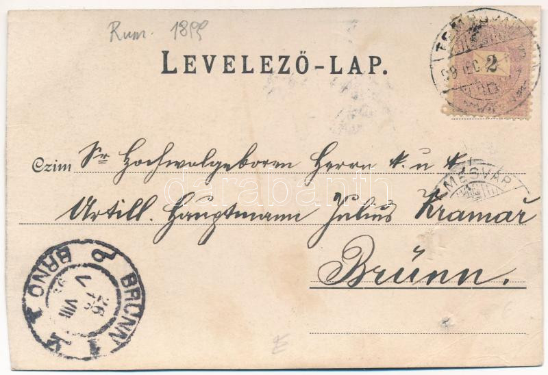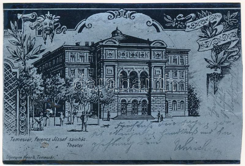 1899 (Vorläufer) Temesvár, Timisoara; Ferenc József színház. Uhrmann Henrik kiadása. Szecessziós fémes hatású fóliás képeslap / Theater / theatre. Art Nouveau metallic foil postcard (b)