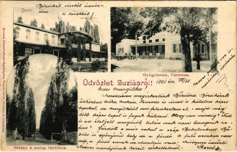 1901 Buziásfürdő, Baile Buzias; Gyógyterem, bazár, sétány a meleg fürdőhöz. Kossak József udvari fényképész kiadása / Cursalon / spa, bath, bazaar, promenade (Rb)