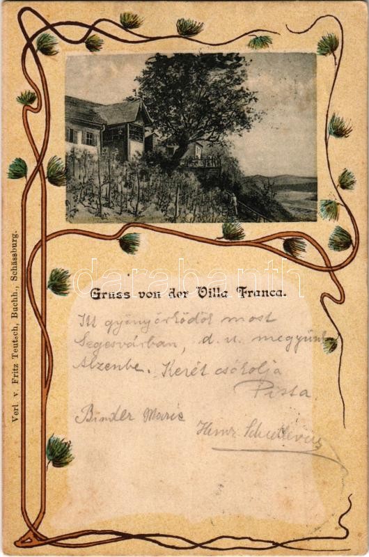 1901 Segesvár, Schässburg, Sighisoara; Villa Franca. Fritz Teutsch Art... https://www.darabanth.com/hu/435-Gyorsarveres/435.0/Kepeslapok/Erdely~2500008/1901-Segesvar-Schassburg-Sighisoara-Villa-Franca-Fritz-Teutsch-Art-Nouveau-litho~II1936033