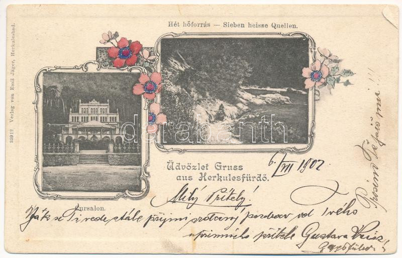 1902 Herkulesfürdő, Baile Herculane; Hét hőforrás, Gyógyterem. Emil Jäger / Cursalon, Sieben heisse Quellen / spa and mineral water spring. Art Nouveau, floral (EK)