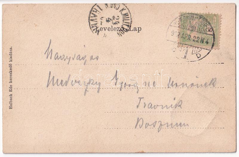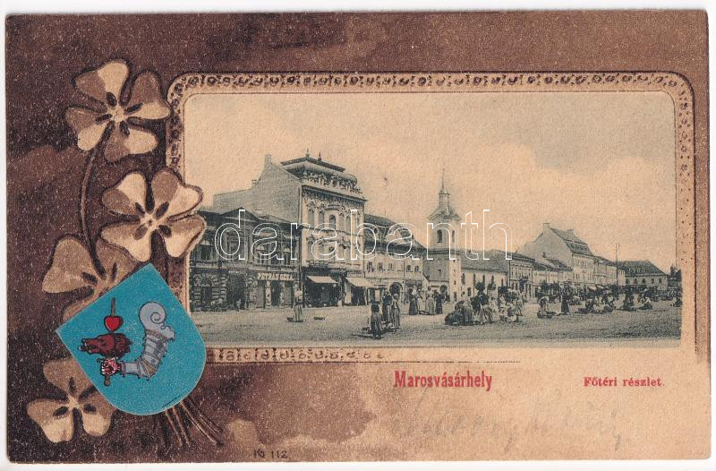 1902 Marosvásárhely, Targu Mures; Fő tér, piac, Petrás Géza, Hart Géza, Schwartz János és József Emil üzlete. Holbach Ede kiadása, szecessziós litho keret címerrel / main square, market, shops. Art Nouveau litho, coat of arms (EK)