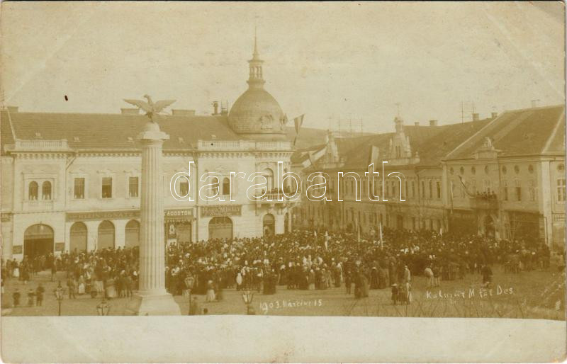 1903 Dés, Dej; Fő tér, Milleniumi emlékmű (1919-én ledöntötték), Március 15-i ünnepség, Klein Ignátz, Bakó Mihály és Lener János üzlete. Kálmán M. felvétele / main square, shops, monument (demolished in 1919), celebration of the Hungarian Revolution of 1848. photo (EK)