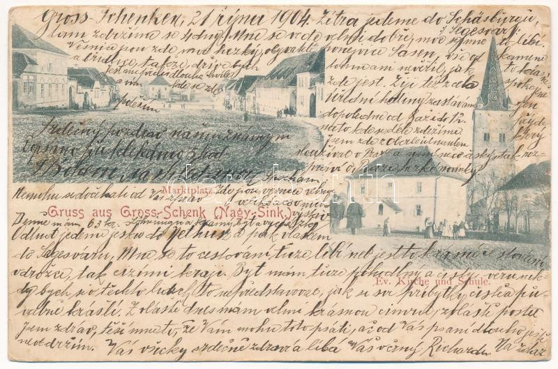 Leírás: 1904 Nagysink, Gross-Schenk, Cincul Mare, Cincu; Evangélikus templom és iskola, Fő tér / church and school, main square (EK)