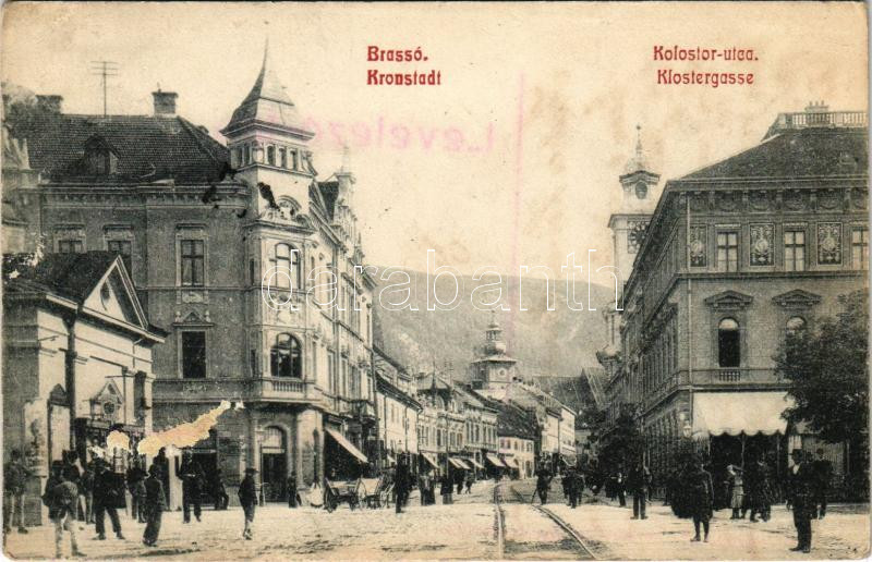 1908 Brassó, Kronstadt, Brasov; Kolostor utca / Klostergasse / street ... https://www.darabanth.com/hu/435-Gyorsarveres/435.0/Kepeslapok/Erdely~2500008/1908-Brasso-Kronstadt-Brasov-Kolostor-utca-Klostergasse-street-view-r~II2817487