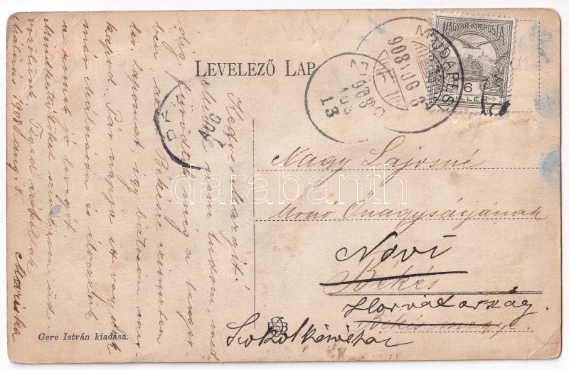 Leírás: 1908 Málnásfürdő, Malnas Bai; vasútállomás, gőzmozdony, vonat, vasutasok. Gere István kiadása / railway station, locomotive, train, railwaymen (EB)