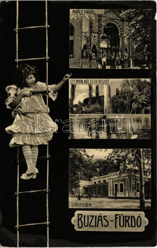 1909 Buziásfürdő, Baile Buzias; Mihály forrás, Szt. Antal kút és tó, gyógyterem. Montázs kislánnyal. Kanton Miklós kiadása / mineral water spring, spa. Montage with little girl (felszíni sérülés / surface damage)
