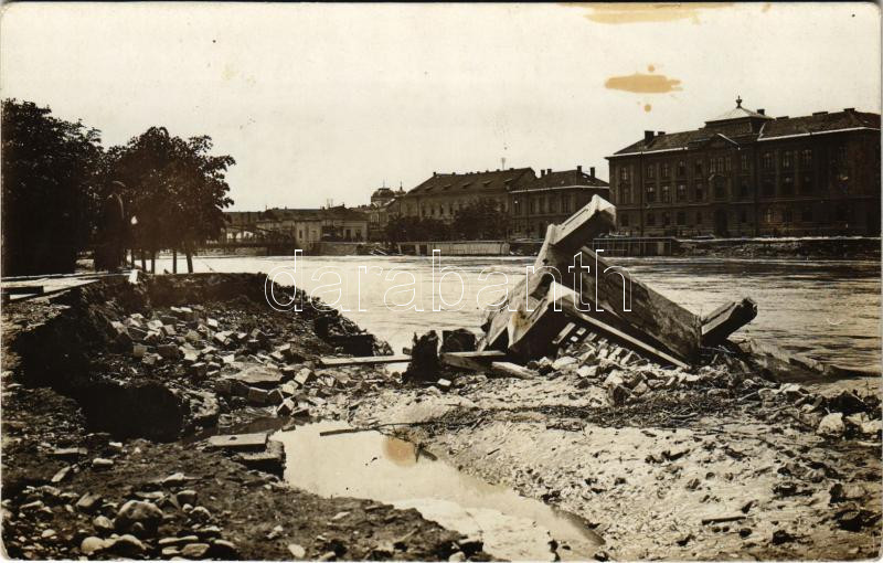 Leírás: 1912 Lugos, Lugoj; árvíz a Temes folyón, Eötvös sor, gimnázium, vasbeton híd maradványai, pusztítások / Timis river flood, bridge ruins. photo