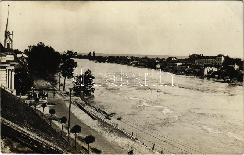 1912 Lugos, Lugoj; árvíz a Temes folyón, Eötvös sor, kilátás a gimnáziumból, református templom és színház / Timis river flood, church and theatre. photo (EK)