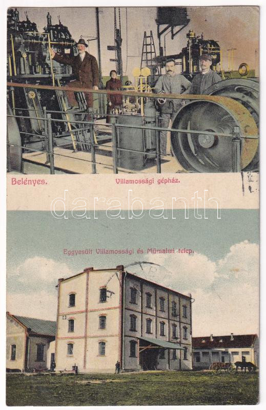1913 Belényes, Beius; Egyesült villamossági és műmalmi telep, villamossági gépház belső munkásokkal. Süssmann Lázár kiadása / power plant and mill, engine house interior with workers