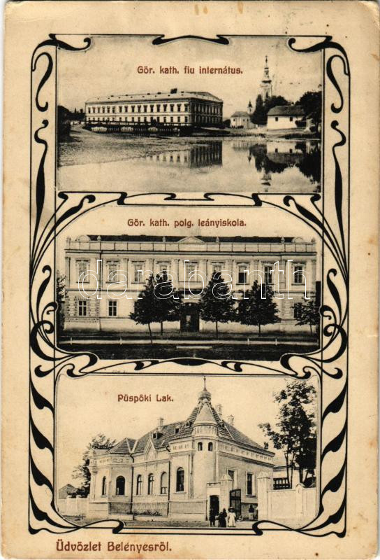 1913 Belényes, Beius; Görög katolikus fiú internátus és polgári leányiskola, Püspöki lak. Wagner Villi kiadása / schools, bishop's palace. Art Nouveau (EK)