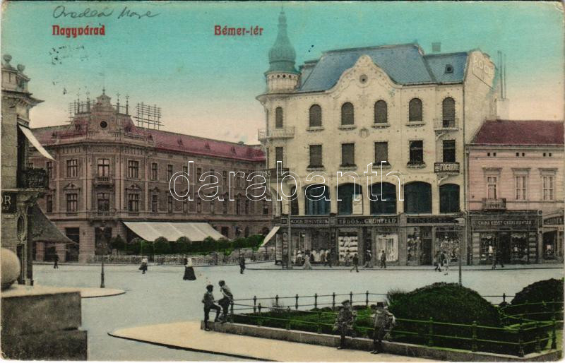 1914 Nagyvárad, Oradea; Bémer tér, Poynár ház, Rimanóczy szálloda, China ezüst gyári raktára, Jelinek Ferencz, Dénes B. Béla, Koch Testvérek, Erdős és Grünfeld és Dr. Kovács Gyula üzlete / square with hotel and shops, dentist (EK)