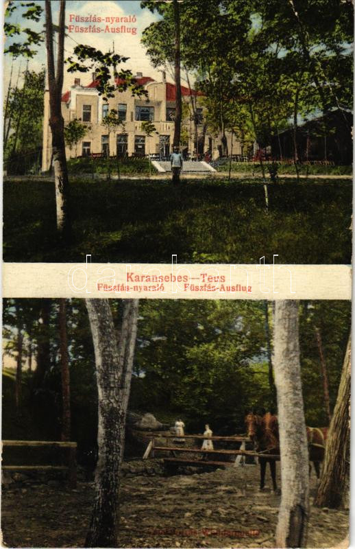 1915 Karánsebes, Caransebes, Teus; Fűszfásnyaraló, Fűzfás nyaraló, szálló. Hátoldalon reklám magyar, német és román nyelven / Ausflug / villa hotel. Advertisement on the backside in Hungarian, Romanian and German (EB)
