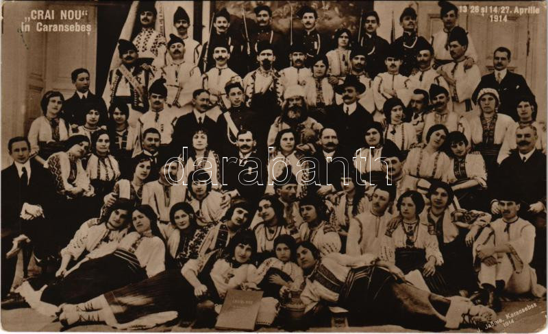 Leírás: 1917 Karánsebes, Caransebes; "Crai Nou" in Caransebes 13/26 si 14/27 Aprilie 1914. / Cari Nou színi előadás / theatre show. J. Jaome Fot. (EK)