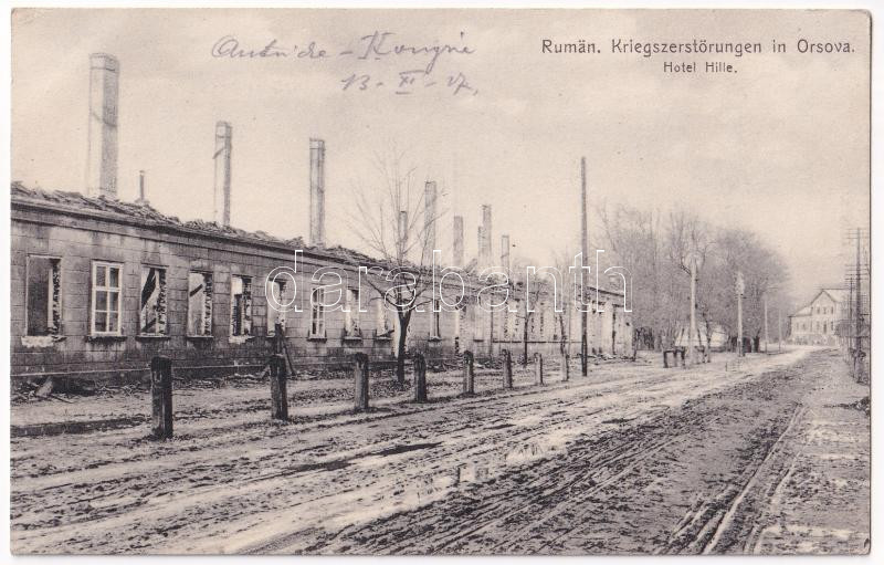 1917 Orsova, Rumän. Kriegszerstörungen / Román háborús pusztítás Orsovában. Hotel Hille szálloda romokban. Hutterer G. kiadása / WWI buildings destroyed by Romanians during the war, ruins of Hotel Hille (EK)