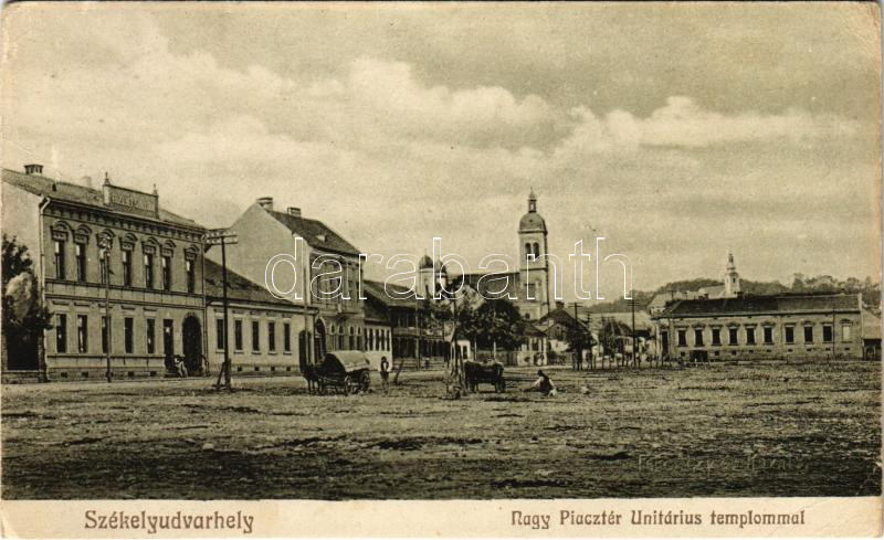 1917 Székelyudvarhely, Odorheiu Secuiesc; Nagy piactér, Erzsébet szálloda, Unitárius templom. Sterba Ödön kiadása / market square, hotel, Unitarian church (EB)