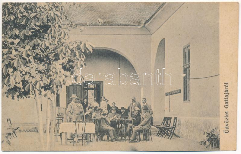Leírás: 1918 Gátalja, Gáttája, Gataia; csoportkép a vendéglő udvarán, étterem. A. Weiser fényképész / group on the restaurant's courtyard