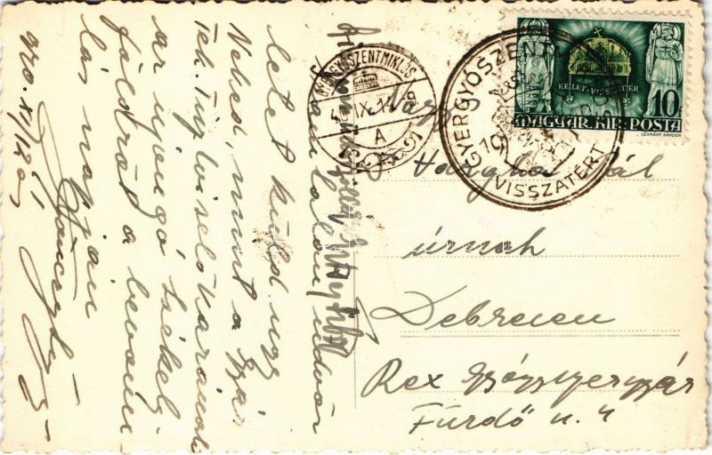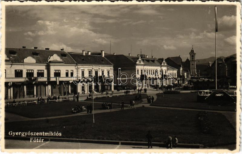 1940 Gyergyószentmiklós, Gheorgheni; Fő tér bevonulási díszben, országzászló, "Éljen Horthy Miklós" és "Magyarország feltámadott" feliratok, Munkásbiztosító / main square during the entry of the Hungarian troops, flag + So. Stpl (EK)