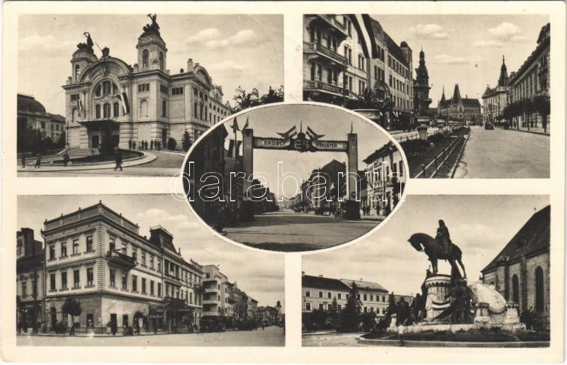 1940 Kolozsvár, Cluj; bevonulás, "Erdély visszatér" díszkapu magyar címerrel és zászlókkal, Minerva biztosító / entry of the Hungarian troops, decorated gate, insurance company