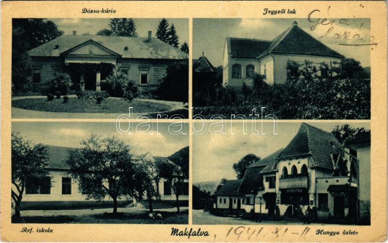 Leírás: 1941 Makfalva, Ghindari; Dózsa kúria, Jegyzői lak, Református iskola, Hangya üzlete és saját kiadása / castle, notary's house, Calvinist school, cooperative shop (EK)