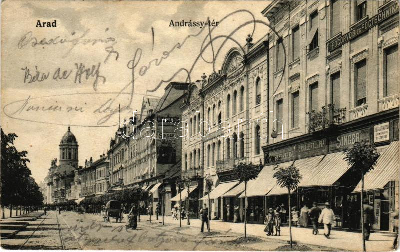 Arad, Andrássy tér, Kilényi, Weinberger János, Singer Sándor, Guttmann és Berger és Grallert J. és fia üzlete, Lengyel Lőrinc bútorraktára, Hajós Árpád gyógyszertára, Dr. D. Graur Victor, Fogorvosi és fogtechnikai rendelőintézet / square, shops, pharmacy, dentistry (EB)