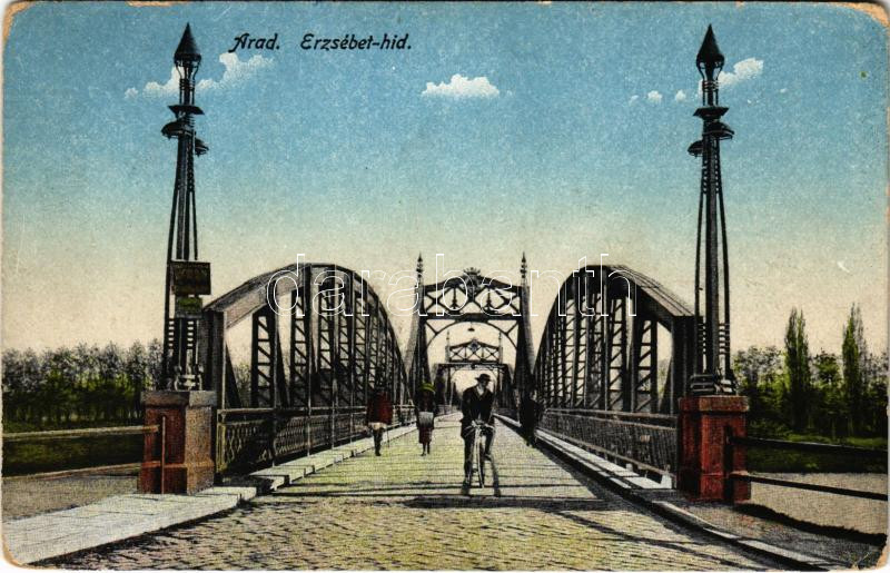 Arad, Erzsébet híd, kerékpáros. Mandl J. kiadása / bridge, bicycle (ko... https://www.darabanth.com/hu/435-Gyorsarveres/435.0/Kepeslapok/Erdely~2500008/Arad-Erzsebet-hid-kerekparos-Mandl-J-kiadasa-bridge-bicycle-kopott-sarkak-worn-corner~II2823272