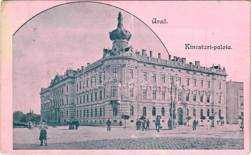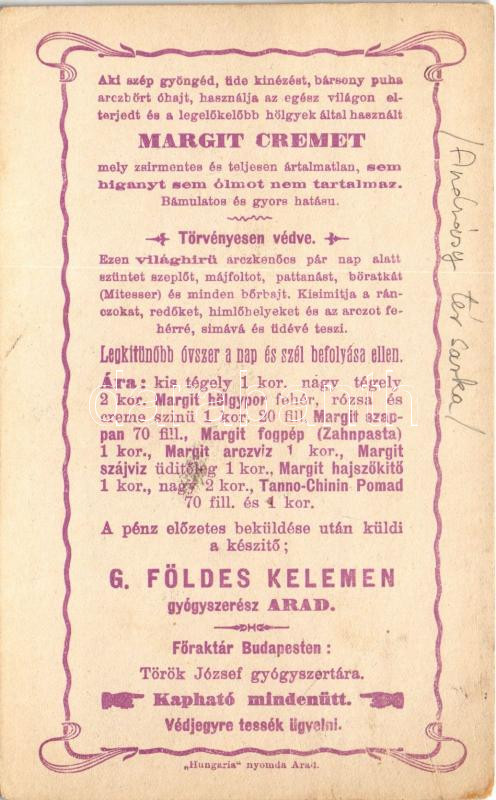 Leírás: Arad, Kincstári palota. Hátoldalon G. Földes Kelemen gyógyszerész "Margit Creme" reklámja / treasury palace. Hungarian cold cream advertisement on the backside (non PC) (r)