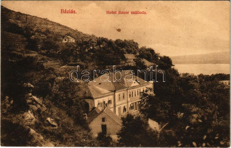 Leírás: Báziás, Hotel Bauer szálloda. Mühsammer Alajos kiadása / hotel (ázott sarok / wet corner)