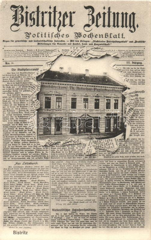 Beszterce, Bistrita; Bistritzer Beitung Politisches Wochenblatt újsággal. Theodor Botschar könyvkiadója és saját kiadású képeslapja / book printing shop, newspaper