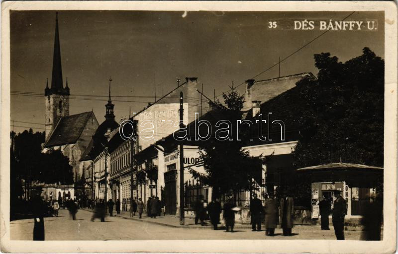 Dés, Dej; Bánffy utca, M. kir. dohányáruda, Fülöp Testvérek divatáruház, radio üzlet, Berger papír és könyv / street, shops (ragasztónyomok / gluemarks)