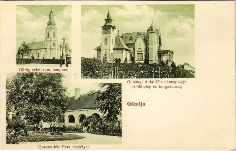 Gátalja, Gáttája, Gataia; Görögkeleti román templom, Gorove féle park és kastély, Gubányi Antal-féle sümeghegyi szőlőtelep és borgazdaság / Romanian Orthodox church, castle and park, vineyards and wine farm