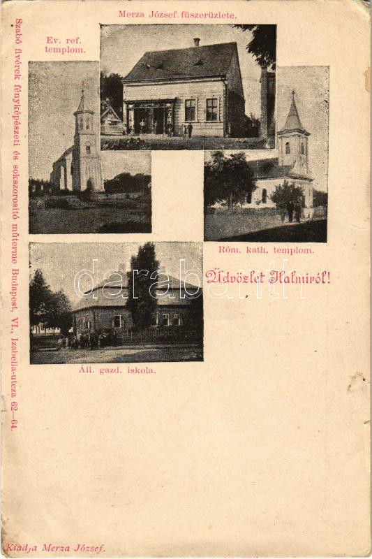 Halmi, Halmeu; Református és római katolikus templom, állami gazdasági iskola, Merza József fűszerüzlete és saját kiadása. Szabó fivérek fényképészeti műterme / churches, agricultural school, publisher's shop (ázott / wet damage)