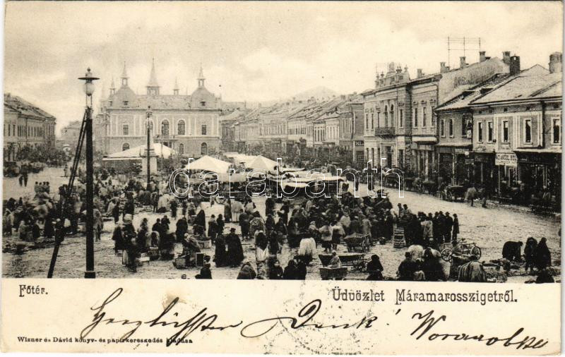 Leírás: Máramarossziget, Sighet, Sighetu Marmatiei; Fő tér és piac, árusok, Angol bolt, üzletek. Wizner és Dávid kiadása / main square, market, shops