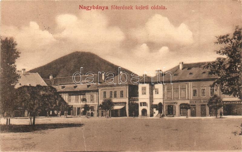 Leírás: Nagybánya, Baia Mare; Főtér, Kindris, Herskovits, Rosenfeld és Mandl, Platthy üzletei, Kovács Gyula kiadása / main square, shops (fa)