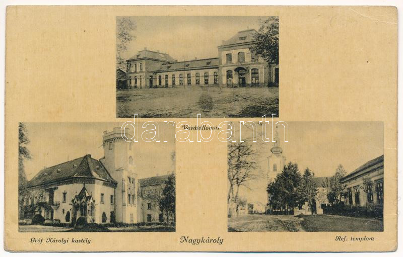 Leírás: Nagykároly, Carei; vasútállomás, Gróf Károlyi kastély, Református templom / railway station, castle, Calvinist church (ázott / wet damage)
