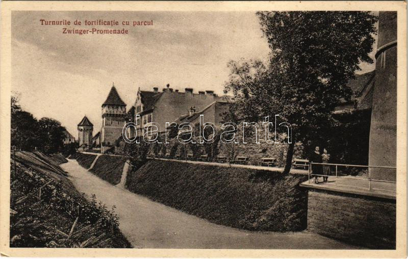 Nagyszeben, Hermannstadt, Sibiu; Turnurile de fortificatie cu parcul Zwinger-Promenade / sétány és tornyok. Jos. Drotleff Nr. 166. 1933. / promenade and towers
