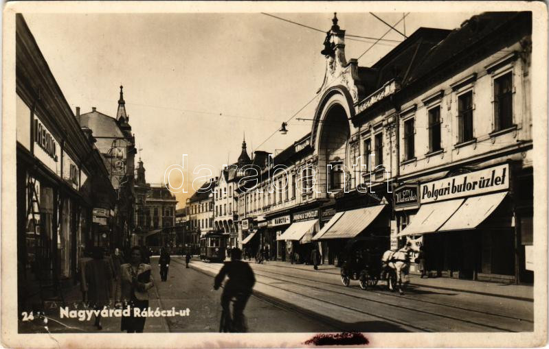 Nagyvárad, Oradea; Rákóczi út, City illatszertár, Polgári bútorüzlet, fodrászat, Vidor Manó, Davidovics István üzlete, Norma cipőüzlet, Hangya szövetkezet, villamos / street view, shops, tram (r)