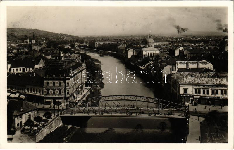 Nagyvárad, Oradea; látkép a Kőrössel, Iván vendéglő és étterem, fodrászat, cukrászat, Friedmann Dezső üzlete, Általános biztosító társaság, Deutsch posztóáruház, zsinagóga, üzletek / Cris riverside, synagogue, restaurant, hairdresser, confetionery, insurance company, shops