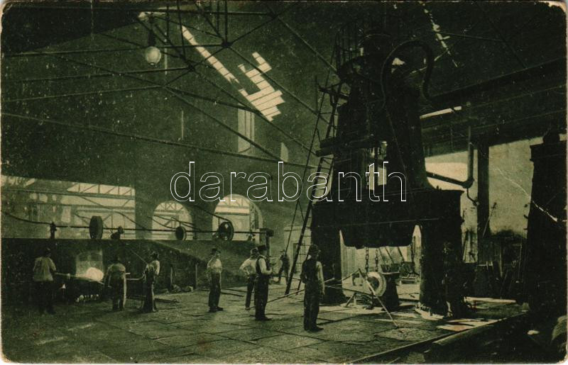 Leírás: Resicabánya, Resita; Gépgyár belső, abroncs hengermű. Weisz Adolf kiadása / Tyreswalzwerk / Forjaria de bandaje / machine factory interior, tires mill (fa)