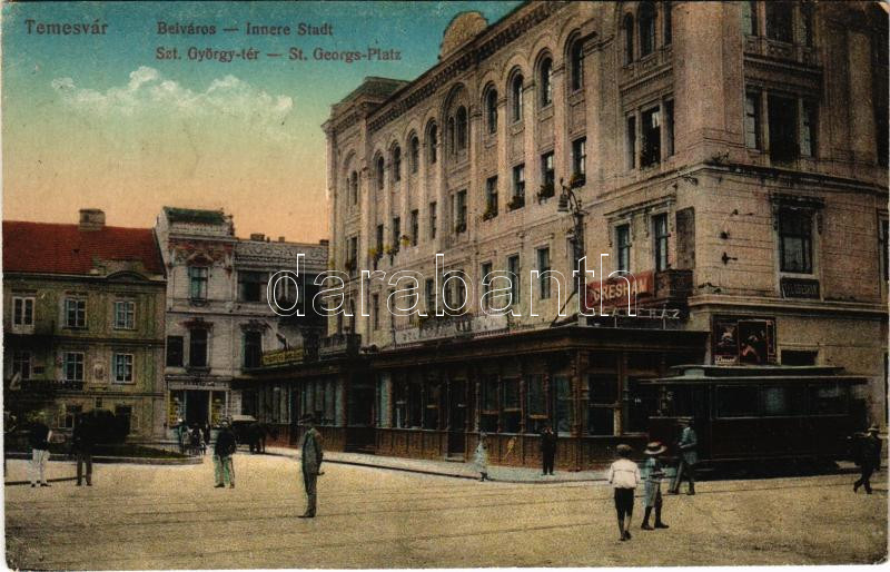 Leírás: Temesvár, Timisoara; Belváros, Szent György tér, The Gresham, kávéház, Kossak József üzlete, villamos / square, café, shops, tram (r)